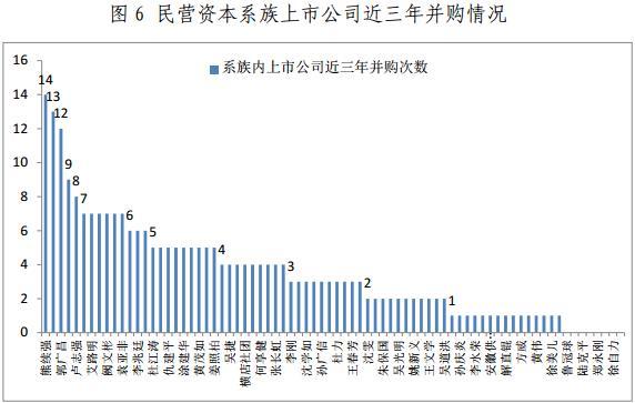 从图6和表5中可以看到,本报告梳理的76个民营资本系族中,有68个系族内上市公司发生过至少一次并购活动,占比接近90%。其中,熊续强家族控制的银亿系内上市公司并购次数最多,三年内完成了14次并购交易;其次为海航系和复星系,近三年内分别完成了13次和12次并购交易。本报告统计还发现,近三年来,179家民营资本系族上市公司共完成262次并购重组,合计金额约4142亿元人民币。