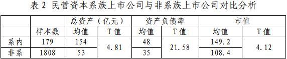 从表2中可以看到,民营资本系族上市公司的总资产均值、资产负债率均值以及市值均值都显著高于非系族上市公司。比如,本报告统计的179家民营系族上市公司和1808家非系族上市公司,总资产均值分别为154亿元和53亿元,前者显著高于后者(T值为4.81)。
