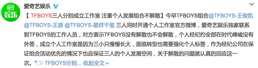 一方面,是公司对于很多唯粉所“期待”的TFBOYS组合解散,作出的明确回应。