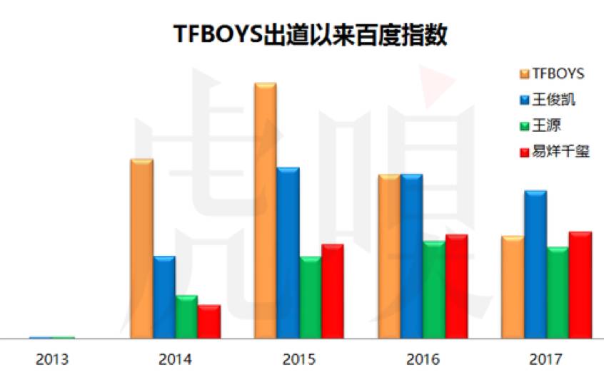 通过对三人出道以来百度指数变化的观察,我们发现,团体的关注度正在随着个人关注度的提高而慢慢下降。这个当初借以推出这个少年偶像团体的“TFBOYS”标签,正在各自粉丝的心目中渐渐隐去。因此,这应该也是公司决定侧重三人个人发展的原因之一。