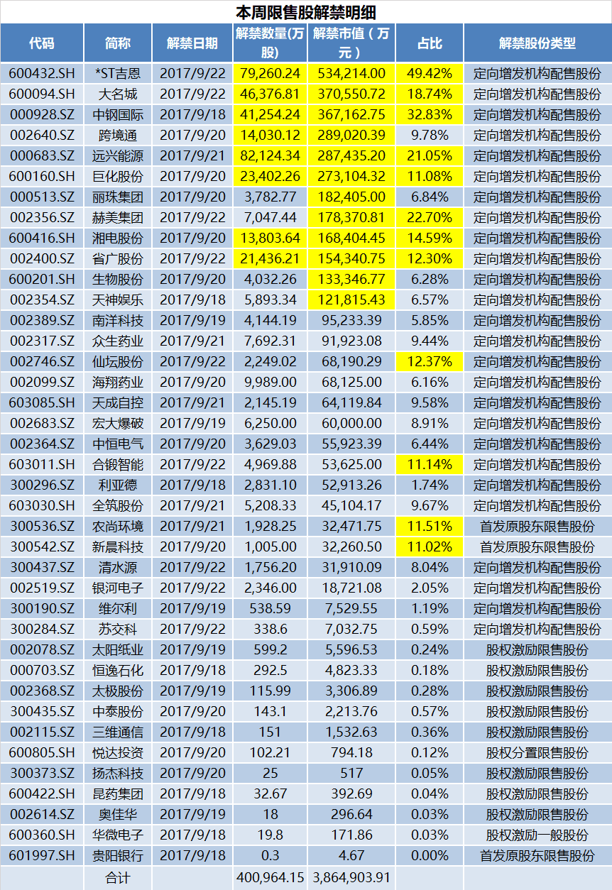 本周限售股解禁规模环比继续下降。Wind数据显示,9月17日-9月22日预计有39家公司限售股陆续解禁,合计解禁40亿股。按9月15日收盘价计算,本周解禁市值合计386.49亿元。