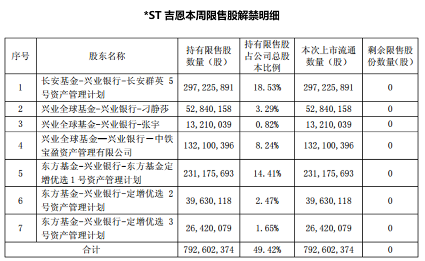 本周解禁市值最大的公司*ST吉恩9月22日有近8亿股限售股上市流通。不过这家公司连续三年亏损,已于5月26日被暂停上市,相关股东能否收回成本还是未知之数。三年前“踩雷”并于此次解禁的股东包括七个,分别包括三只兴业全球基金、三只东方基金资管计划及长安基金群英6号资管计划。