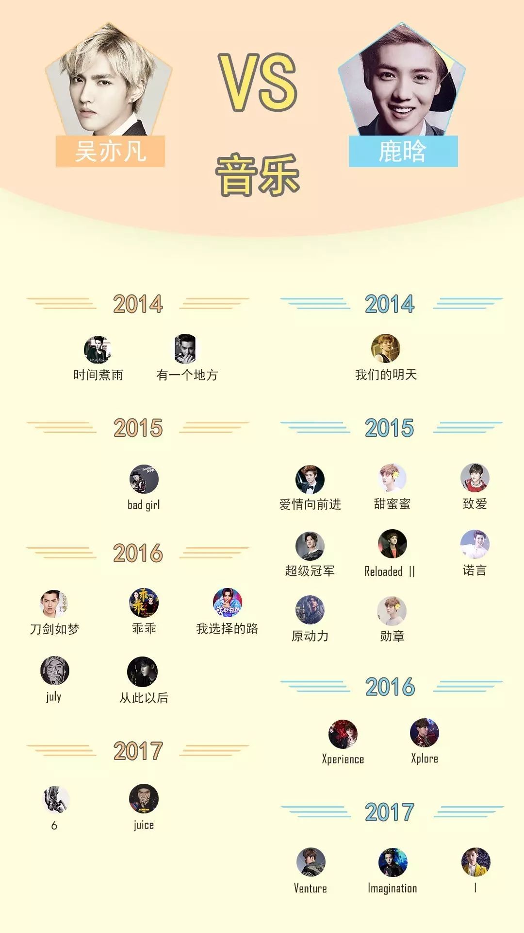 吴亦凡和鹿晗二人都曾是韩国偶像组合EXO的成员,二人回国之后也没有忽视对音乐市场的开发。如果说二人在代言、杂志封面、影视剧方面有较高重合性,那么他们在音乐方面的表现则天差地别。