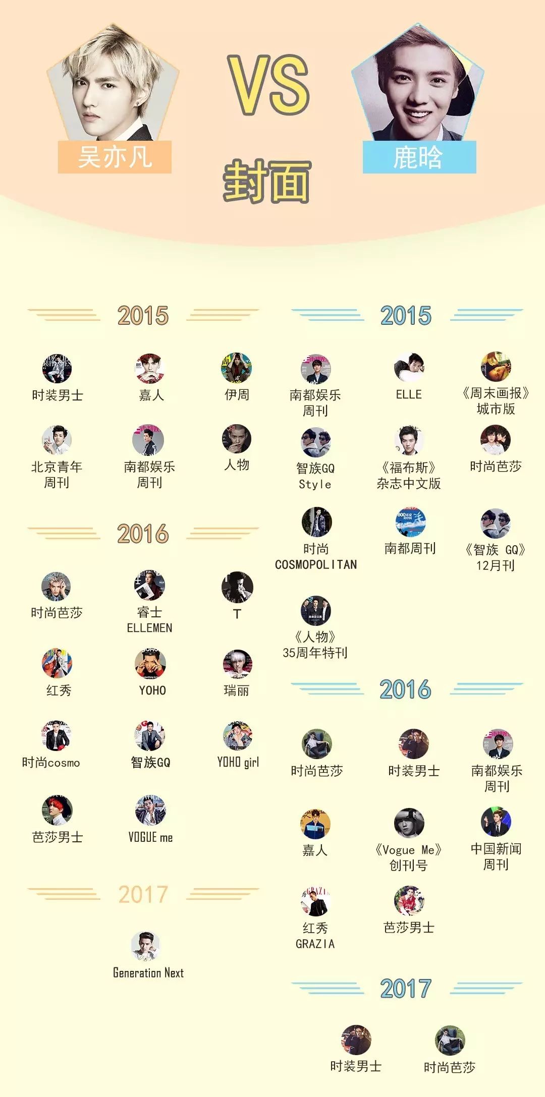 和代言产品一样,在单人杂志封面的体现上,鹿晗仍以数量取胜,但在完成度上,吴亦凡则领先一步,而且因高端杂志的稀缺性和二人市场定位的相似性,吴亦凡和鹿晗在杂志选择上有很大的重合度。