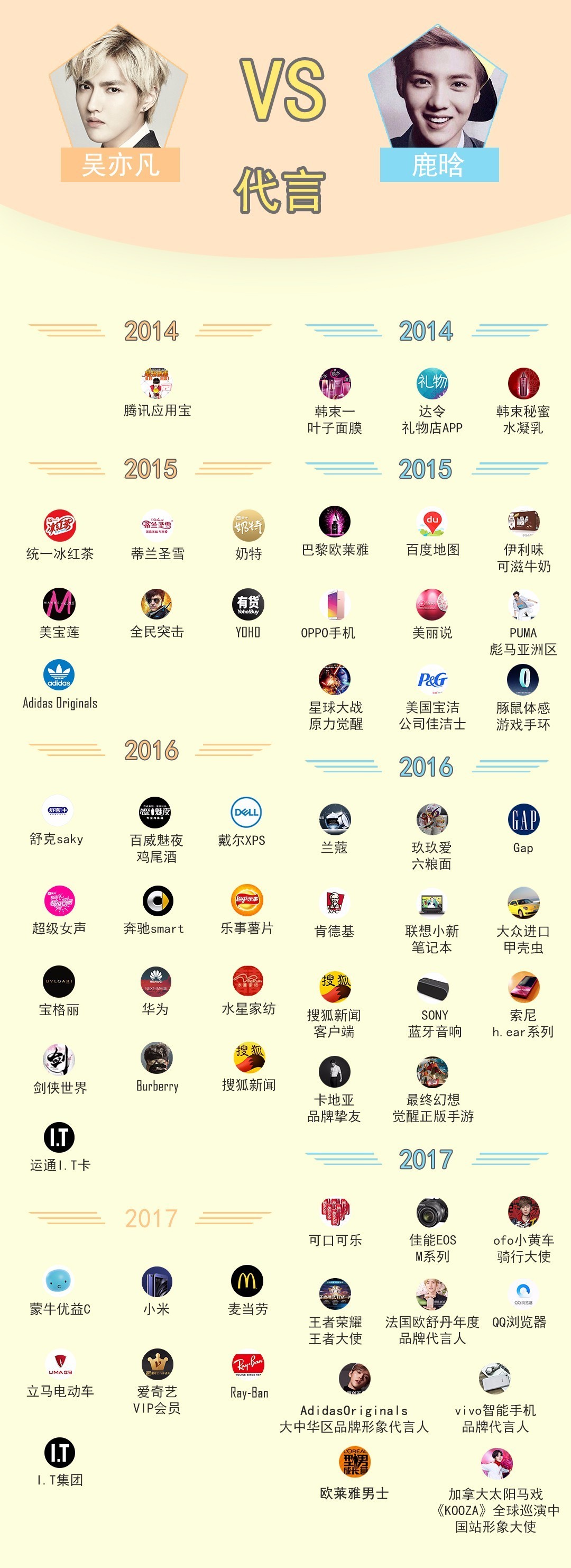 尽管吴亦凡和鹿晗的粉丝都不想把“撕”放到台面上,而是暗暗较劲,但从代言来看,二人一直针锋相对。你代言肯德基,我代言麦当劳;你代言OPPO、vivo,我代言华为、小米;你代言联想,我代言戴尔···而欧莱雅和搜狐新闻,双方均有代言。