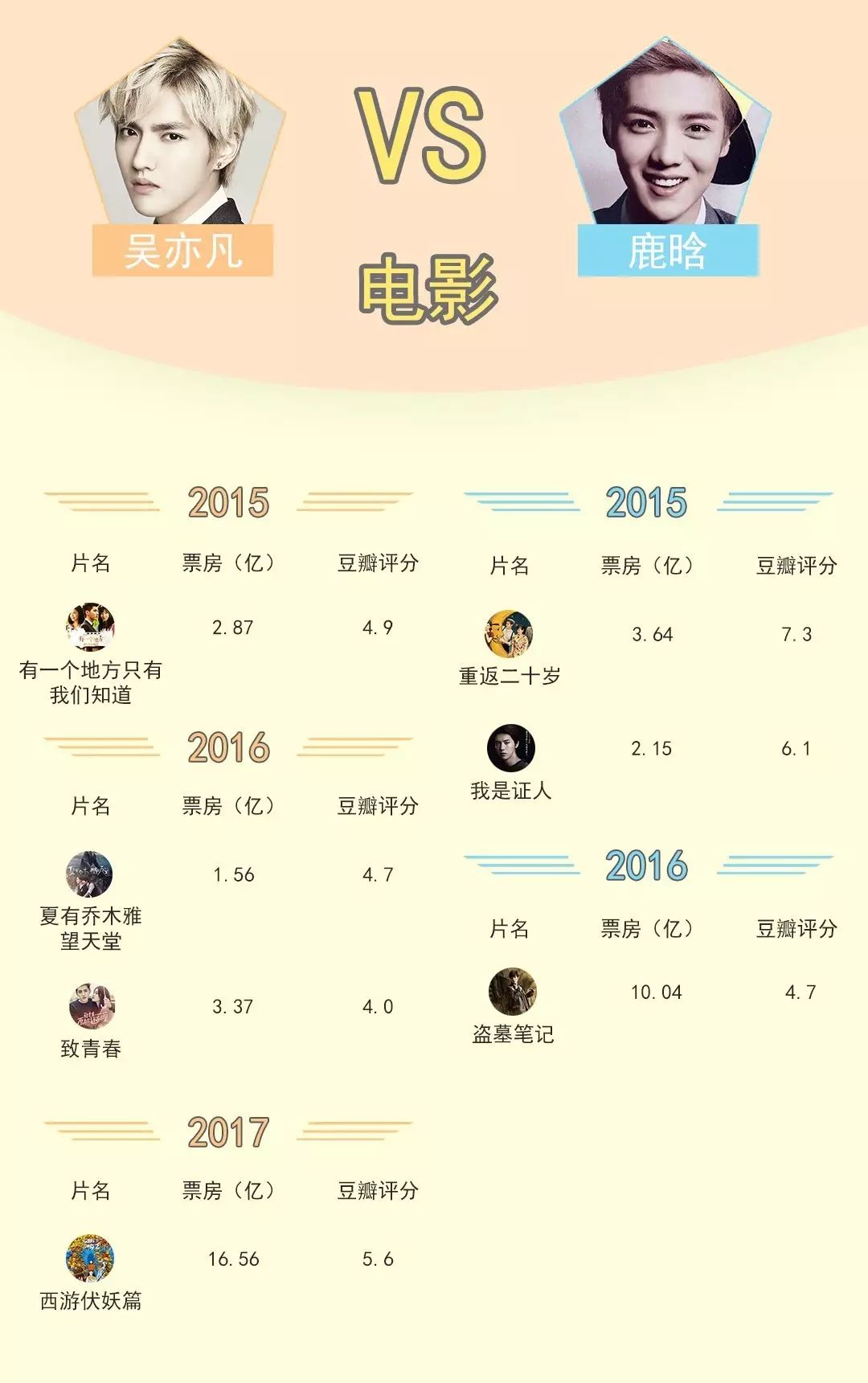 在吴亦凡和鹿晗担任主角的电影中,吴亦凡累计票房较高,鹿晗则胜在口碑。吴亦凡主演电影中,票房最高的当属《西游伏妖篇》,该电影也是他主演电影中口碑最高的一部,但遗憾的是仍然没有及格。而鹿晗主演电影中,《盗墓笔记》票房最高,但口碑也最低。