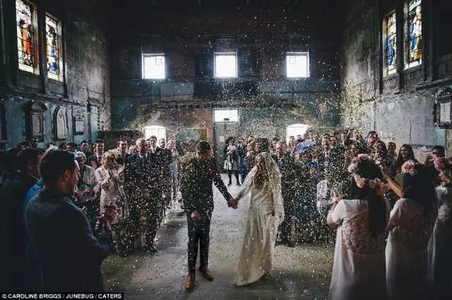 婚礼仪式刚结束,这对新人被捕捉到沐浴在闪烁的五彩纸屑中。