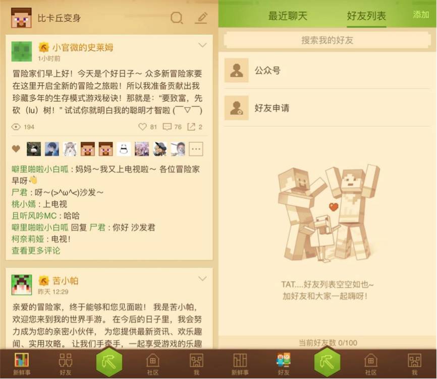 《我的世界》手游囊括了“新鲜事”、“好友”、“游戏”、“社区”和“我”五个板块。“新鲜事”板块主要是用户发布《我的世界》相关的信息,它的设置与微博非常相似,每条动态都可以进行点赞、评论和转发。“好友”系统则是建立玩家紧密联系的方式之一,玩家之间可以通过搜索昵称来加好友,最终达成好友联机玩游戏的状态。
