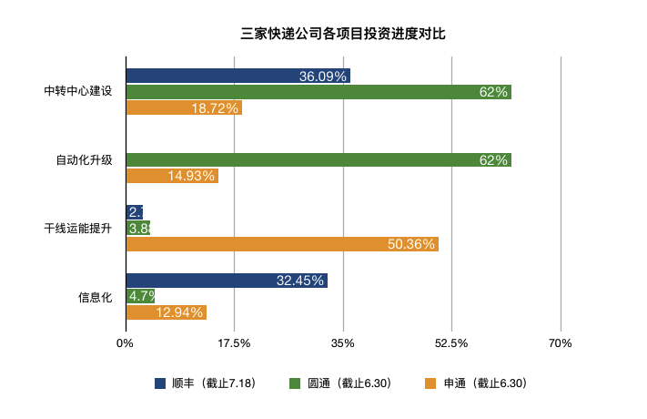三家快递公司在各项目投资进度如下(韵达进度未知):