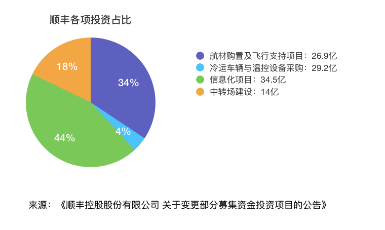顺丰在上个月刚刚发布公告调整募集资金用途,根据最新调整公告,新增“飞行购置改装”项目,拟投入8.4亿元;四大项目中,唯一对信息化建设增加投入,冷运项目与中转场建设均减缓投资。