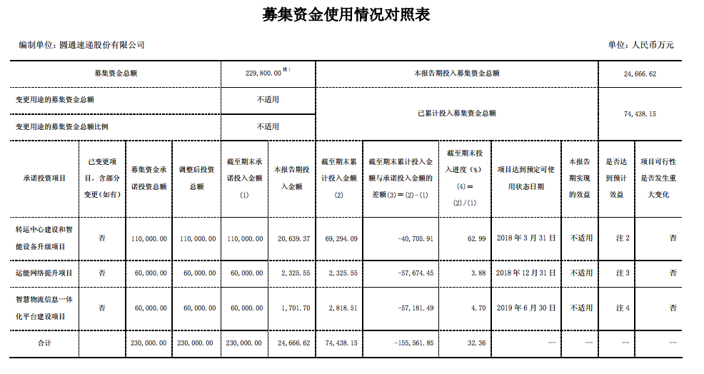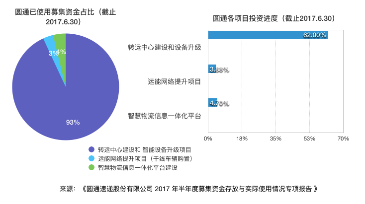根据圆通发布公告显示,截至2017年6月30日,公司已使用募集资金23.04亿元,其中用于募集资金投资项目建设资金7.44亿元,募集资金余额(包括银行存款利息)为737万元,募集资金已所剩无几,具体使用情况及各项目进度如下: