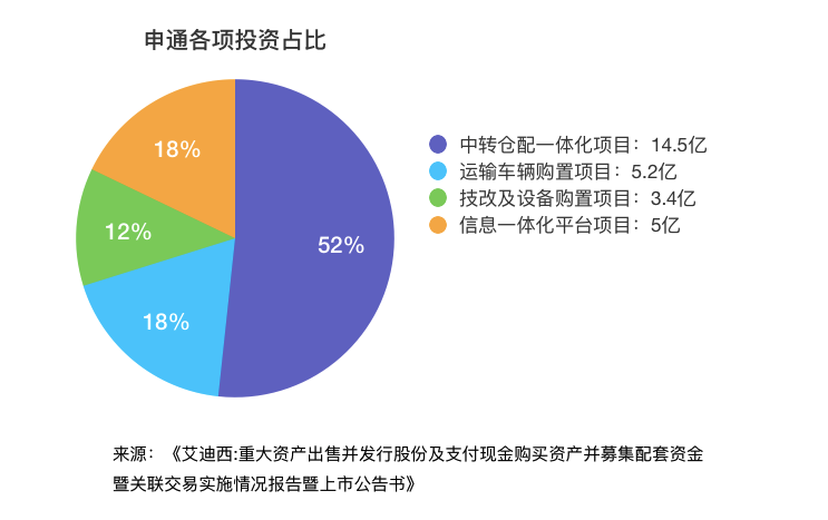 申通上市时发行募集资金总额为48亿元,扣除发行费用后主要用于四大项目,投资金额与占比如下: