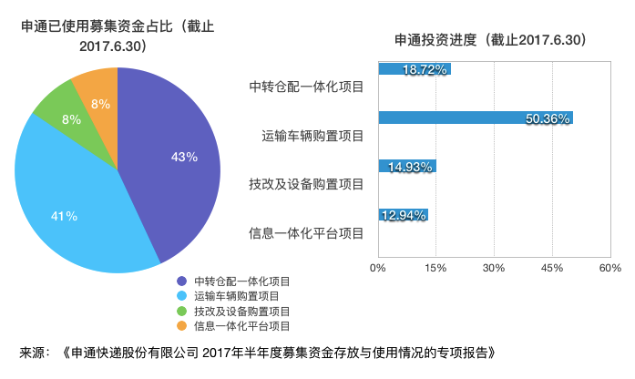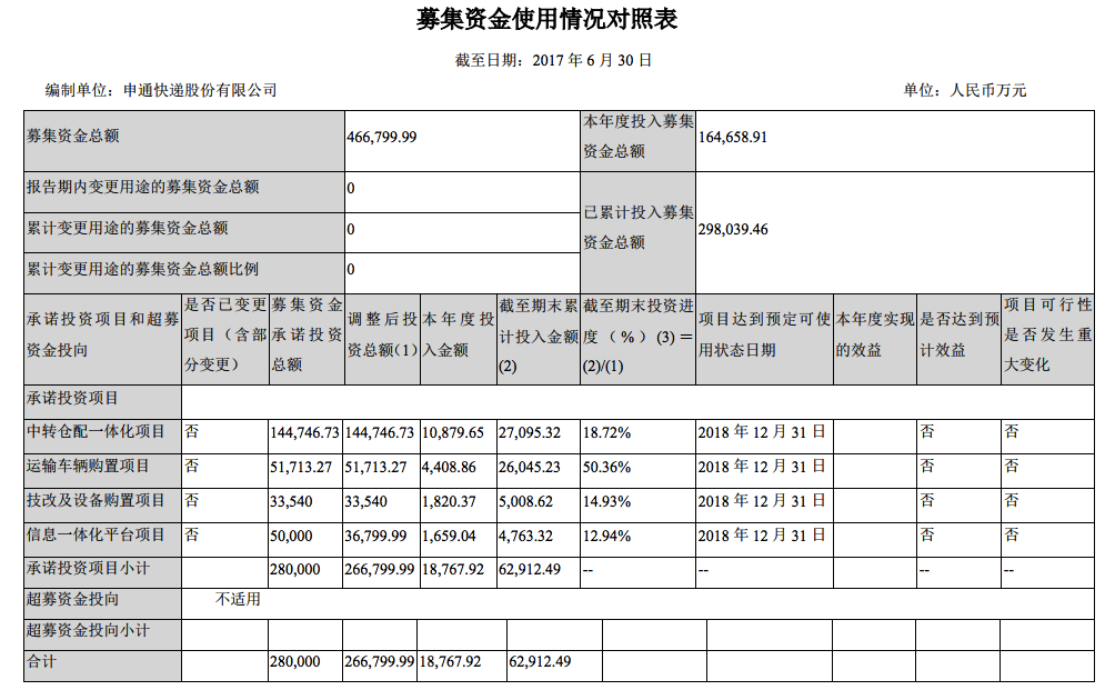 根据申通公告显示,2016年度及2017年度上半年,公司实际累计使用募集资金30亿元,其中承诺投资项目投资为6.3亿元,截至2017年6月30日,募集资金余额为16.88亿元(包括银行存款利息),募集资金使用情况及项目进度如下: