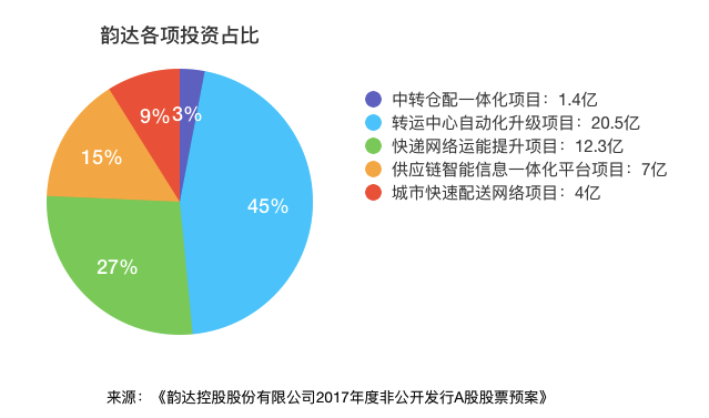 通过图表可以看出,韵达与上述几家不同,中转中心使用募集资金不多,只占据3%,最主要的是自动化升级,占据45%。