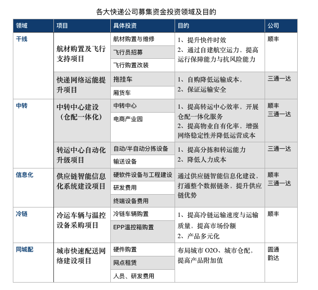各家募集资金用途主要集中于:干线、中转中心、信息化、自动化升级、冷链和同城配送几个领域: