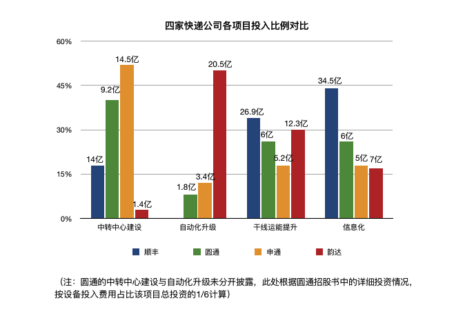 根据各家公告,四家快递公司的募集资金在各个项目投入金额及比例如下: