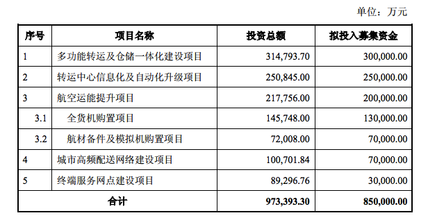 顺丰在借壳上市同时募集资金80亿元,扣除发行费用后主要用于四大项目: