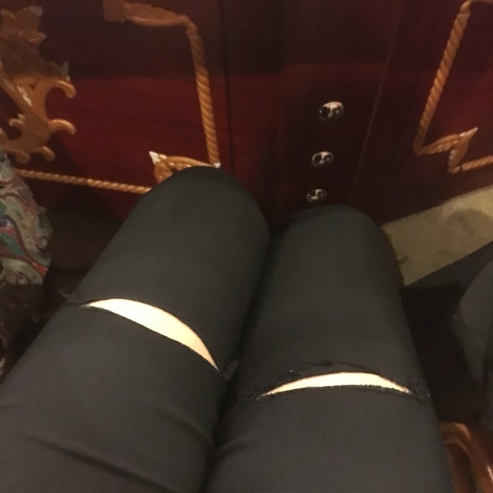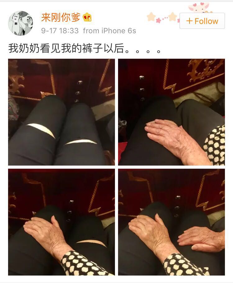 我穿破洞牛仔裤 破洞在膝盖那里 我外婆看到了非要给我缝上说是怕我得风湿病