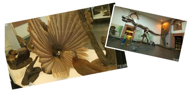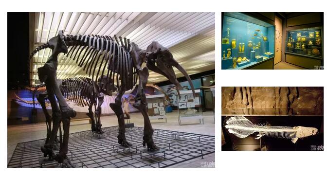 博物馆中的陈列也非常讲究,例如其中的象类展厅,以各种古象的臼齿化石为实证反映了象类的起源与演化关系,然后以这些象类化石为依据形象地绘制出象类在整个地球上发展、散布和演化的过程图,给观众以直观的印象,最后,将几种大象的骨架和同等大小的复原模型与现代鲸鱼的巨大骨架陈列在一起,使观众感受到大千世界里各种生物“万类霜天竞自由”般的奇异。