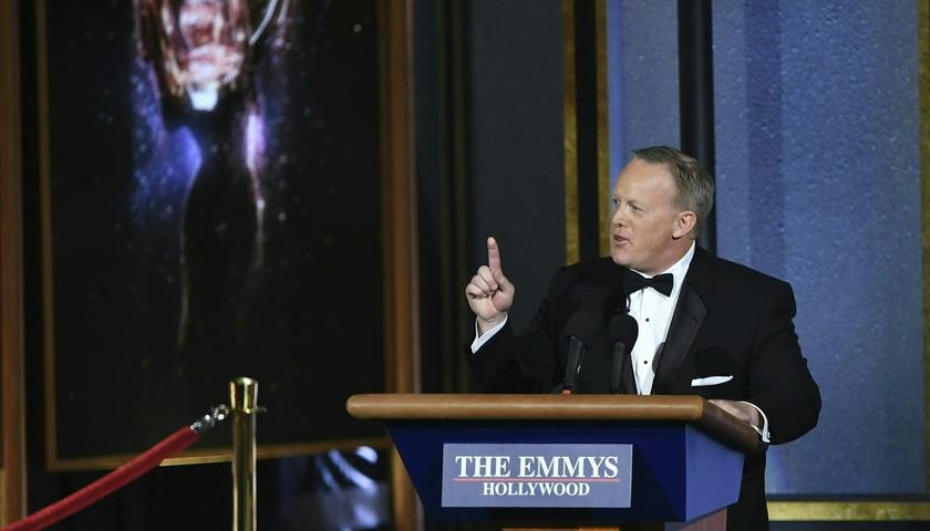 前白宫发言人肖恩·斯派塞推着一个领奖台走上了台前:“这将是艾美奖有史以来观众最多的一次,就是这样——不论是到场观众还是全世界各地的观众。”