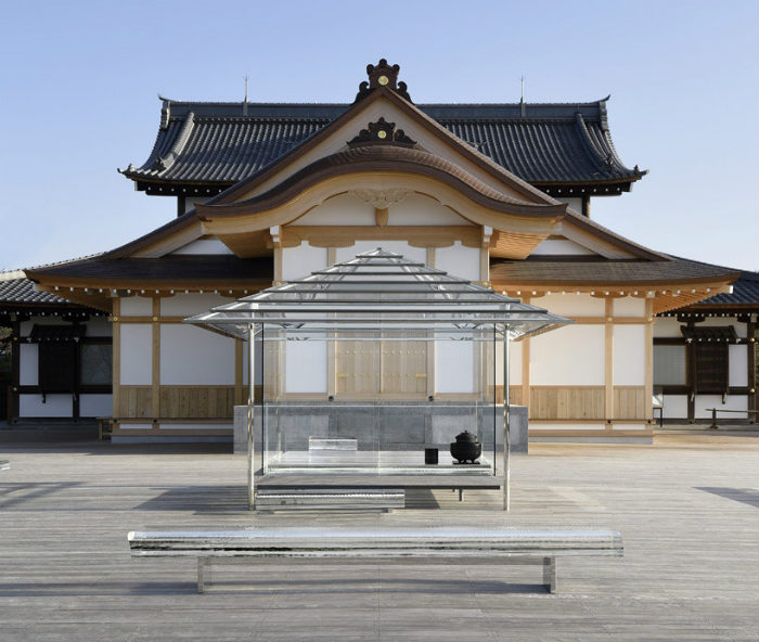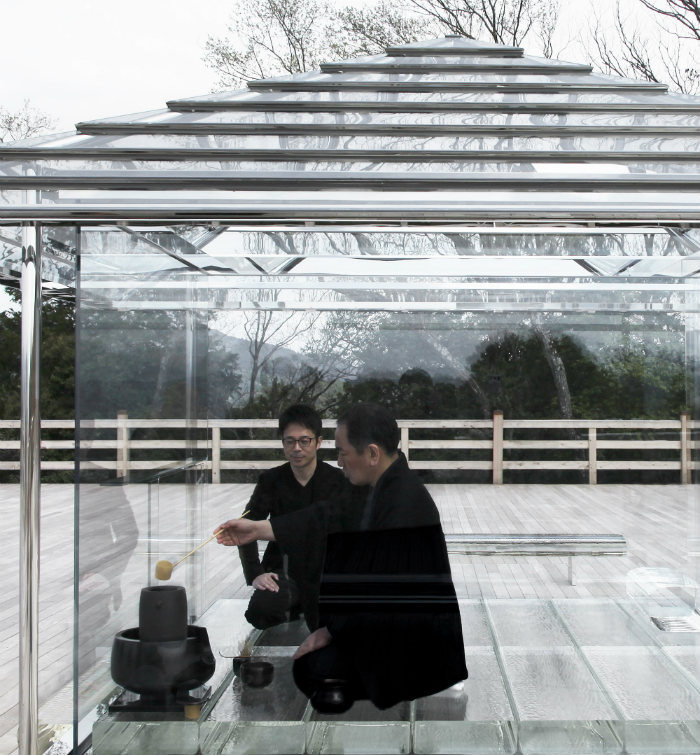 2002年,吉冈德仁在无意中看到的一张全透明日本居室的建筑平面图,这让他开始构思全透明的玻璃建筑。而后,在2011年威尼斯双年展的平行展“Glasstress”上,这一理念被落实成一座纯玻璃制造的日本茶室模型,首次面对公众展出。2015年,正值京都和佛罗伦萨缔结姐妹友好城市50周年,这座玻璃茶室在意大利以模型的姿态展出5年后,最终以1:1的原型尺寸,永久安放在京都东山上的青龙殿外。