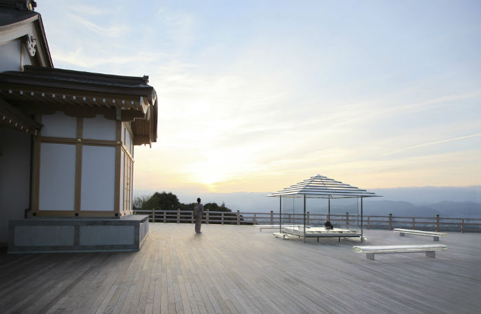 玻璃茶室的位置,就坐落于殿外大舞台的正中央。茶室从屋顶到台阶均由玻璃构成。室内除了烹茶用的茶炉与储存茶叶的茶罐之外,再无任何非玻璃的陈设,也完全不像传统茶室那样有卷轴、插花等装饰,因此并不显得过分华丽或矫饰,反而有种简约、纯净的透彻感。远远望去,与周围的木构古建筑也能奇异地融为一体,就像玻璃金字塔与卢浮宫那样相得益彰,并没有突兀的存在感。