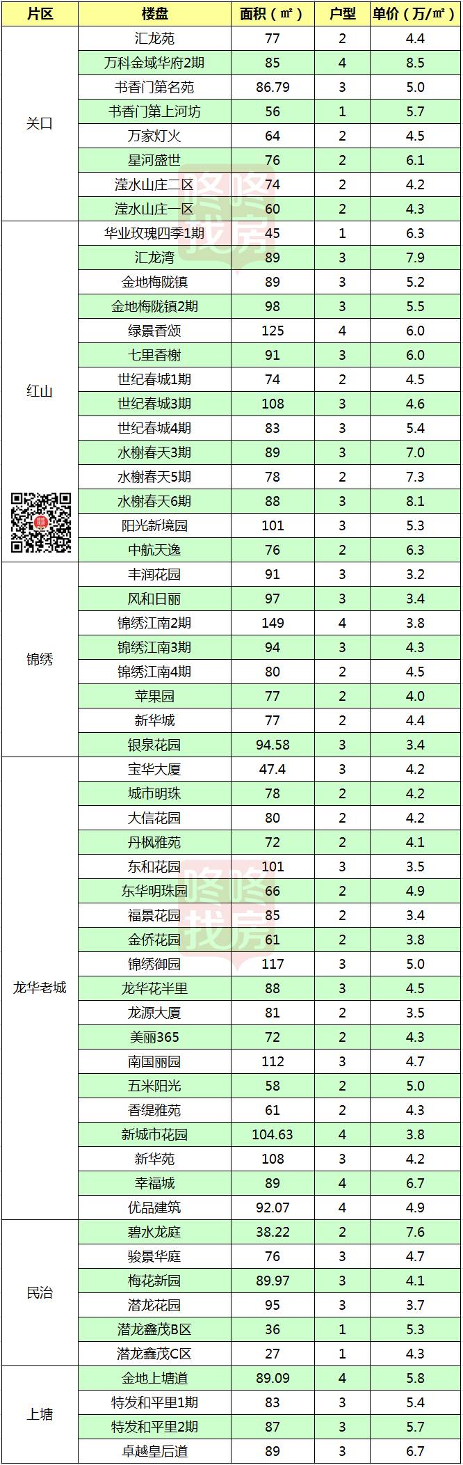 户型方面从成交面积的统计数据就能看出来,投资客或刚上车的置业者首先想到的就是关口和民治的小户型,其他片区基本还是以刚需喜闻乐见的小三房为主。