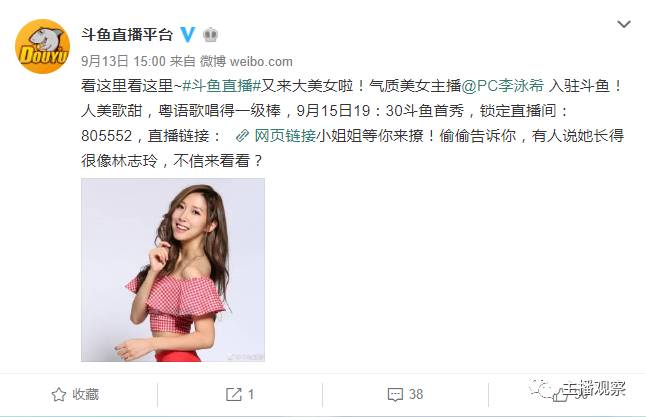 来自香港美女唱歌主播李泳希最近入驻斗鱼,李泳希微博证人是一名主持人,在14年参加过知名节目《非诚勿扰》。