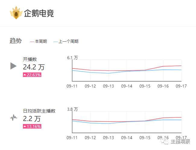 企鹅电竞的主播数据对比上周上涨了13%,平台发展情况良好。