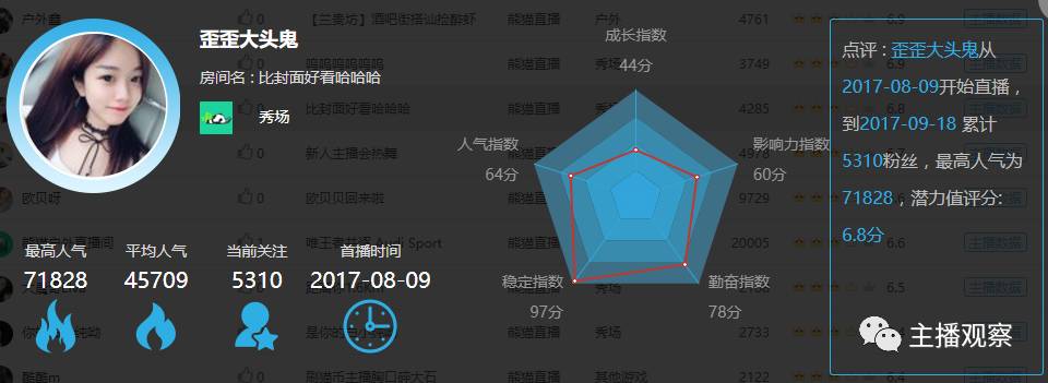 本周潜力主播:歪歪大头鬼,熊猫星颜主播。歪歪大头鬼是一名熊猫星颜主播,内容以唱歌和聊天为主。