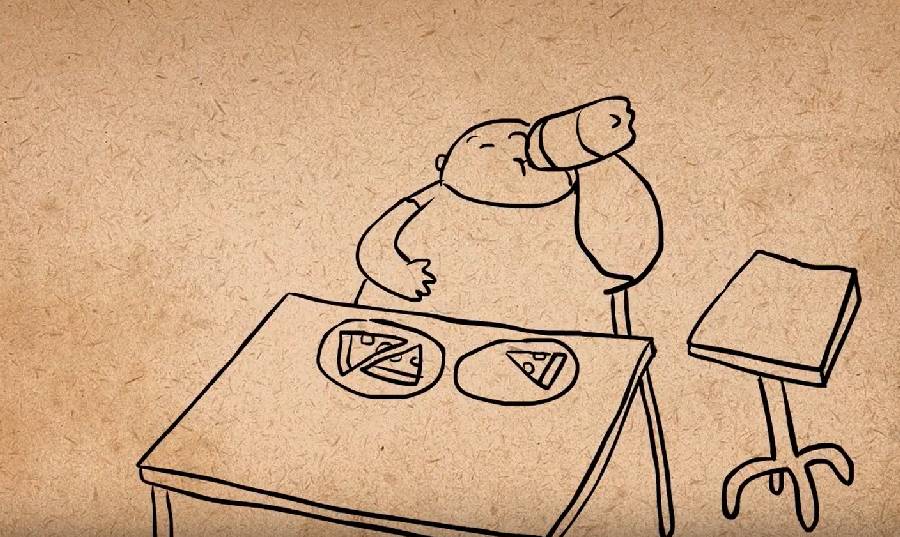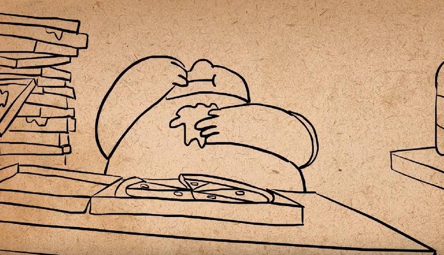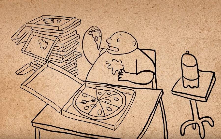 如果我们想要传达的想法是一个过度进食者,我们就可以给场景更多设置:给他更多披萨,后面加一大堆披萨盒,衣服上加污点,还可以把摄像机移动到他下方以让给他显得更大: