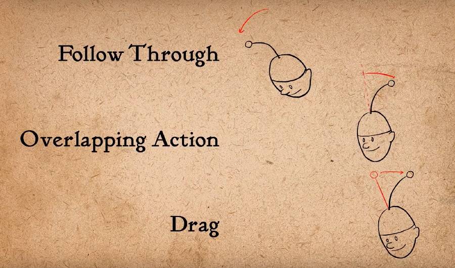 这些名词都用不同方式阐述同一件事,比如,跟随动作说的是身体静止后身体部件(由于惯性)还在继续运动;重叠动作说的是主体和它的其他部件的时间错开(产生重叠效果);拖拽说的是延迟身体各部位跟主体之间运动的技巧。