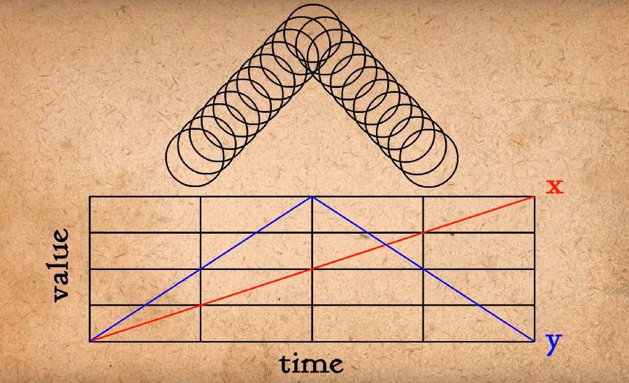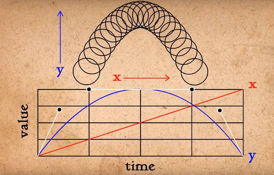 比方说我们有这些关键姿势并被告知要做中间张。单纯取中间点做中间张是行不通的,因为这看上去过于机械化。球体需要遵循弧线运动,当然我们也需要考虑由于重力引起的渐快与渐慢。在3D和MG动画中我们可以将X轴保持不变,给Y轴加渐快与渐慢 以达到这个效果,这就给球体一个弧线运动。
