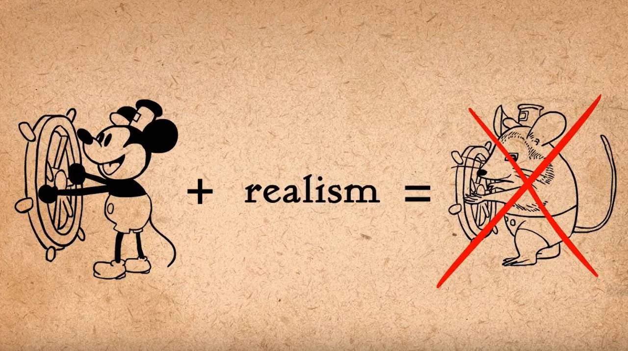 迪士尼早期动画师会感到困惑,因为华特告诉他们添加更多的真实感,但当他们修改后他会批评结果不够夸张。在华特看来(真实与夸张)可能没什么不同,逼真不意味着让物理和比例更接近现实,而是让想法或动作更加明显真实。