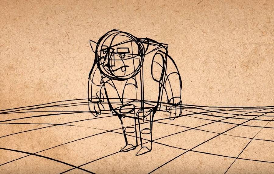 举个例子:当你画球体的一条线,线必须在球体轮廓表面上,直线会立马让圆圈看上去很平;画立方体的时候,避免画平行线,线应该弯向消失点,否则看上就是个扁平标志或标识;给角色画草图轮廓的时候,使用如球体、立方体和圆柱体的基本立体形状去塑造角色,而不是用圆圈、正方形和矩形。这会帮你注意到他们所在的空间。