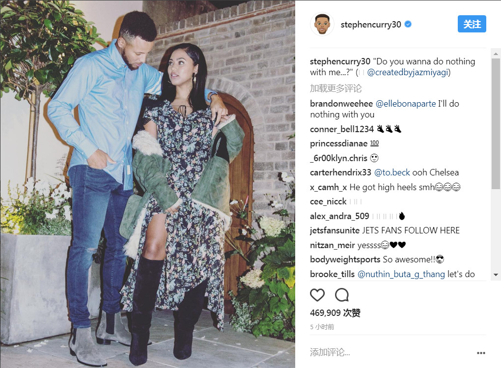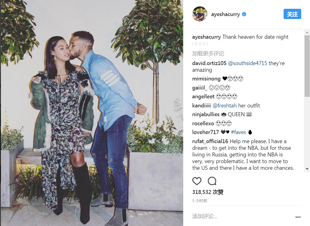 今天,勇士球星斯蒂芬·库里在Instagram上传了一张和娇妻阿耶莎亲密合照,并说:“你想和我待在一起什么事也不做吗……”同时,库嫂阿耶莎也在Instagram上传了他们的另一张合影,并说:“感谢上天给我们这个约会之夜。”两人狂撒狗粮。