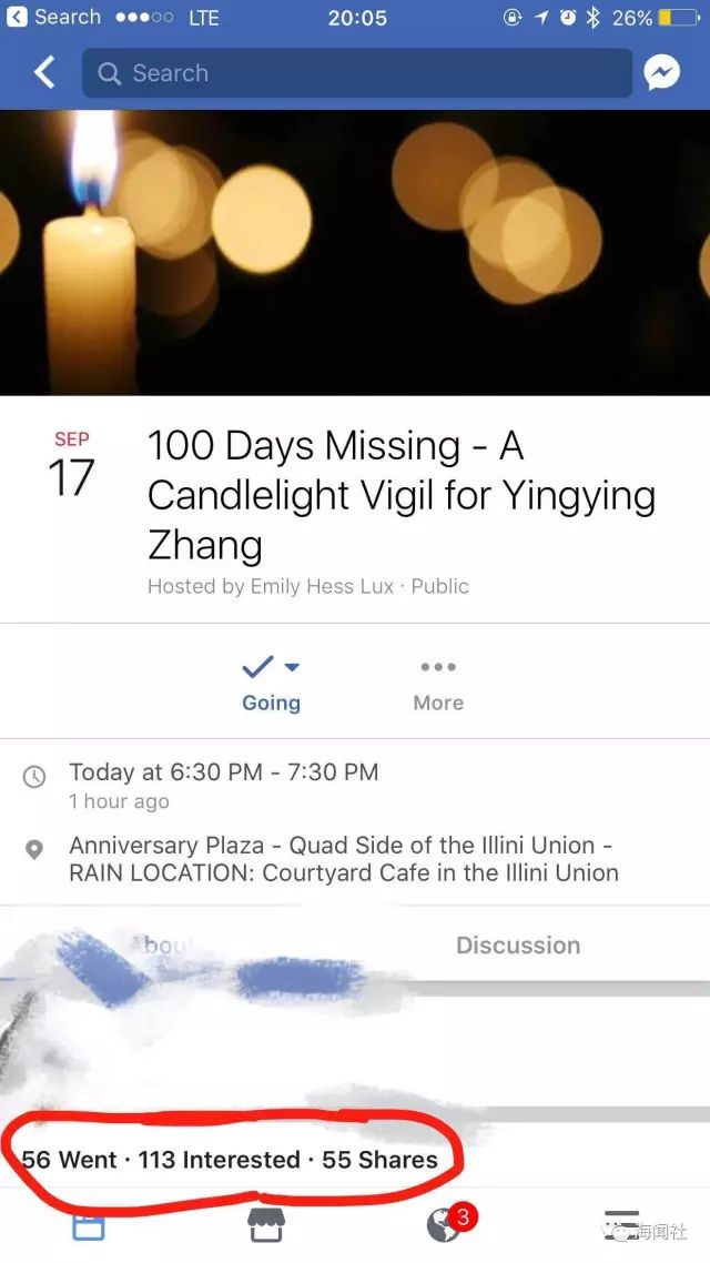 9月17日是中国访问学者章莹颖在美国失联100天的日子,她是生是死,迄今仍然是个谜。当地时间17日晚,美国伊利诺伊大学香槟分校(UIUC)举行章莹颖失踪百日的烛光晚会。点点烛光,寄托着校友们对莹颖的思念之情。大家都对她的生还抱有最后一丝希望。