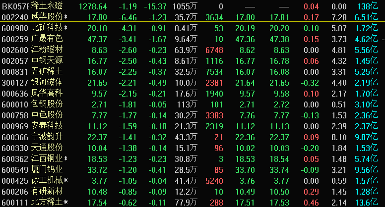 今日稀土永磁板块较为低迷,早间高位开盘后震荡明显,午后2点,有加速下滑趋势,有近20股收跌,稀土永磁整体下滑1.19%,广晟有色下滑3.41%,五矿稀土下滑逾2%。