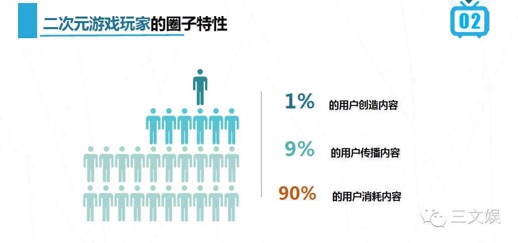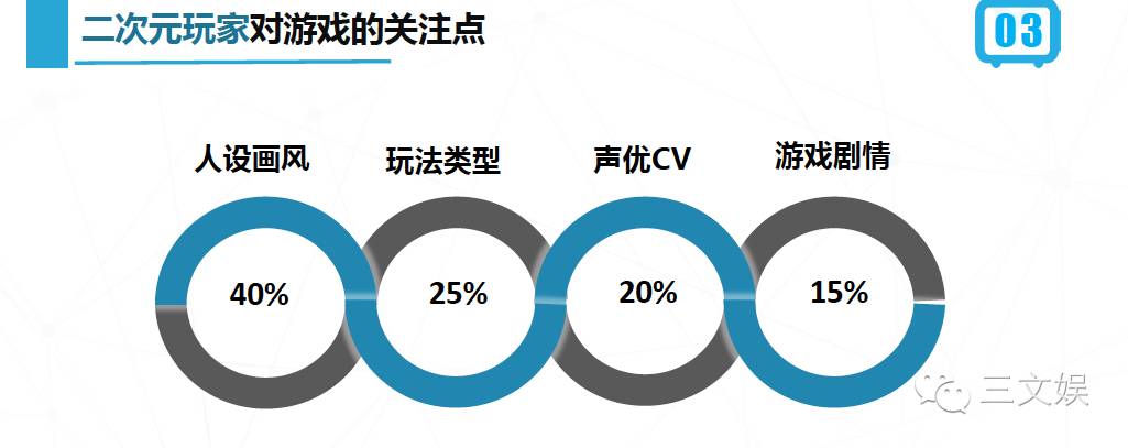 拥有动漫IP的游戏不等于二次元游戏,拥有动漫画风的也不一定是二次元游戏。玩家主要关注四个方面:第一是人设画风,占到40%,不是动漫卡通就是二次元;第二是玩法类型,玩法也足够创新的游戏,在二次元用户中会得到更广泛的欢迎;第三声优是非常重要的标配;第四是二次元的用户非常重视剧情。