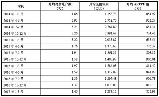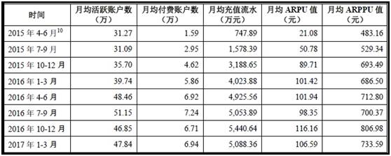 2017 年 1 季度,《偶像梦幻祭》月均活跃用户数达 47.84 万人,月均充值流水达 5088.36 万元。