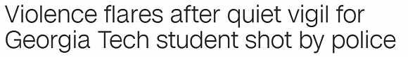 【乔治亚理工学院发生暴力冲突 此前一学生被警察射杀】乔治亚理工学院周一晚上为一名被警察射杀的学生举行守夜活动,随后爆发了暴力冲突。这名学生上周六晚上手持刀具与警察对峙,之后被警察开枪打死。