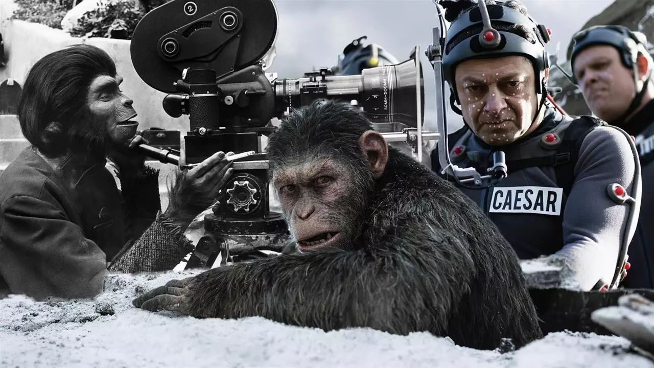 1)和人类角色和穿着动捕服装的猿类角色同时拍摄;