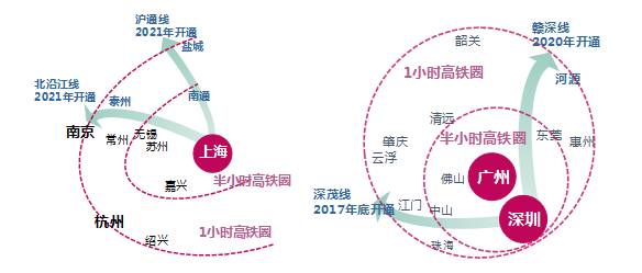 图:新建高铁通车后上海及广州、深圳1小时高铁圈城市范围变化