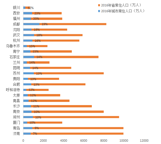 ☆省域人口规模。区别于一线城市的是,以省会城市为代表的二线城市人口吸引的作用人群仍主要集中于本省内部,其辐射范围很难超越行政界限。因此,分析不同城市背后存在的省域人口基数对判断后期人口规模走向具有重要的意义。在综合考虑城市当前的人口集中程度、城市受周边其他城市影响分流之后,总体来看,成都、武汉、杭州、合肥、长沙、郑州等城市后期的人口集中度仍存在进一步提升的较大可能。