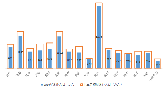 图:二线综合铁路枢纽城市人口及十三五规划人口目标对比
