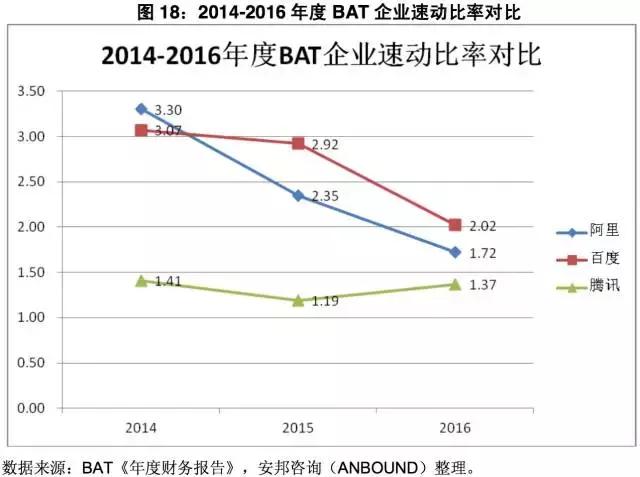 图18:2014-2016年度BAT企业速动比率对比