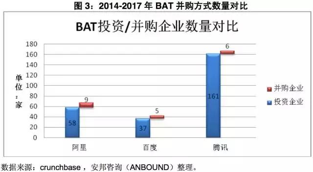 图3:2014-2017年BAT并购方式数量对比
