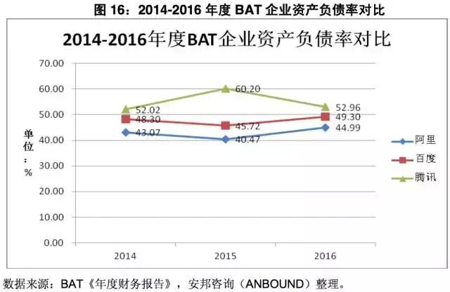 图16:2014-2016年度BAT企业资产负债率对比