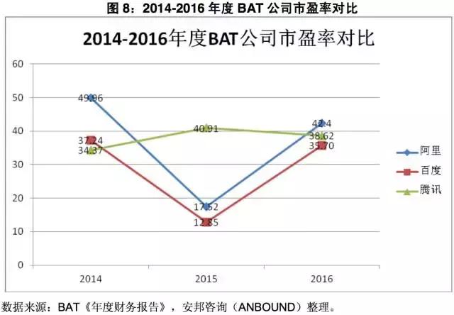 图8:2014-2016年度BAT公司市盈率对比