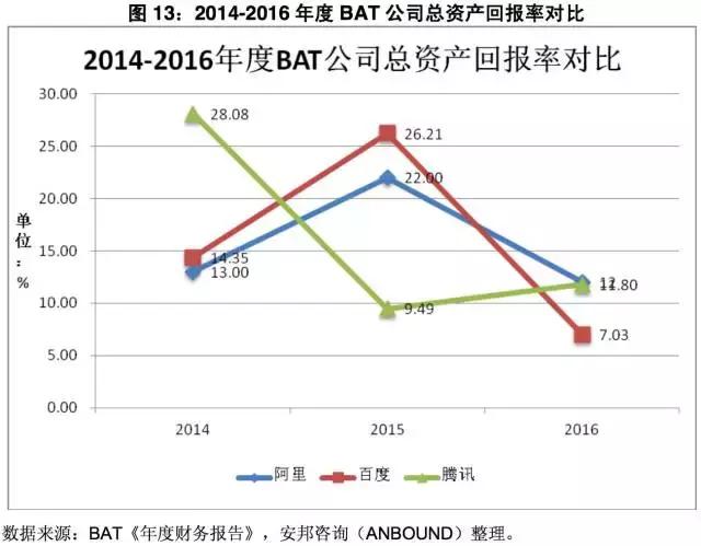 图13:2014-2016年度BAT公司总资产回报率对比